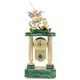 Каждая деталь часов выполнена с исключительным вниманием к деталям. Фигура Святого Георгия Победоносеца, отлитая из бронзы, покоится на постаменте из натурального долерита, шпонированного благородным малахитом (известным своим происхождением из Конго) и латуни, безупречно покрытой золотом (20 мкм высшей пробы) и искусно украшенной ручной гравировкой.